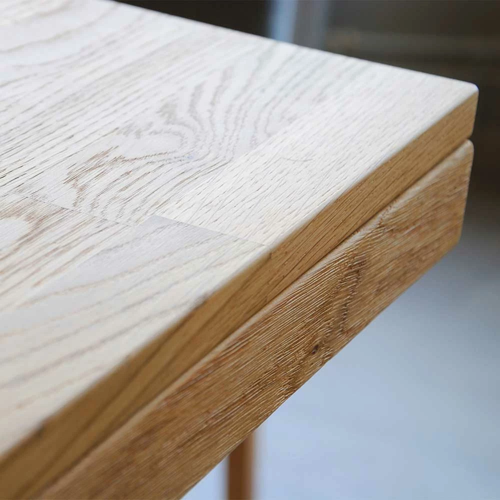- Massive Tischplatte mit einer Stärke von ca. 1,8 cm, am Rand aufgedoppelt auf ca. 4 cm