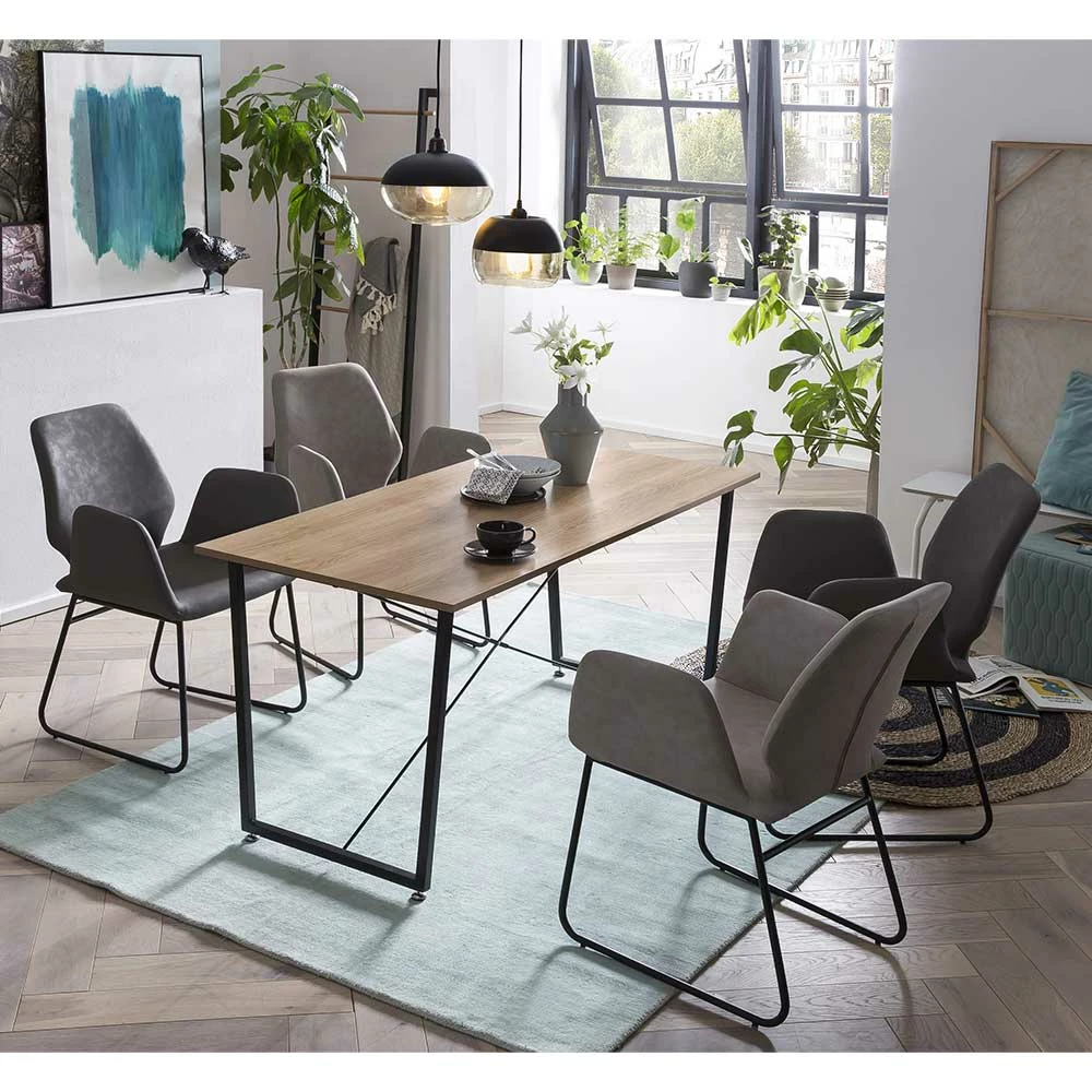 - Stilsichere Essgruppe in Akaziefarben, Hell- und Dunkelgrau sowie Schwarz