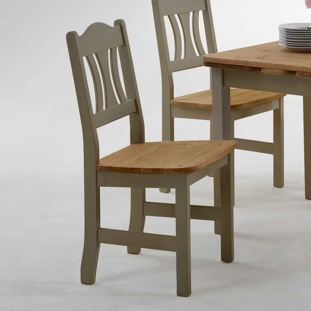 - Tisch- und Stuhlbeine, sowie die Stuhllehnen sind grau lackiert & gebeizt, die Tischplatte & die Sitzflächen der Stühle sind laugenfarben geölt & gebeizt