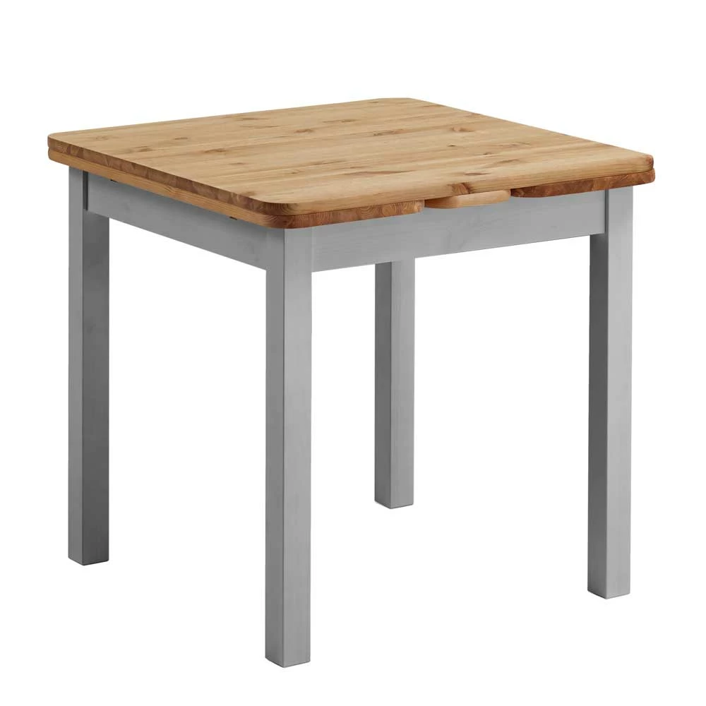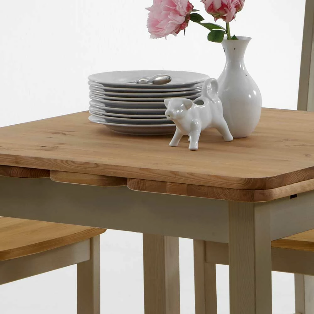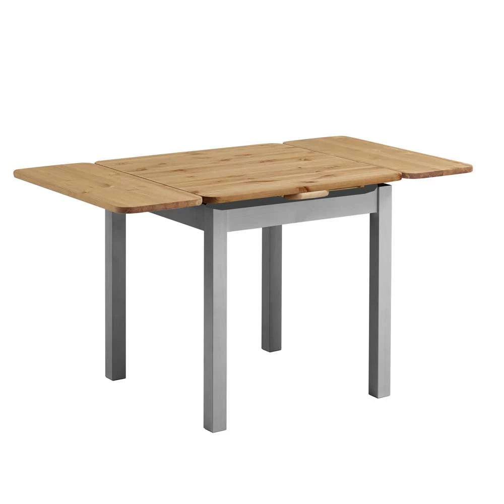 - Der Tisch ist mit zwei Ansteckplatten um je 25 cm von 77 auf 127 cm verlängerbar