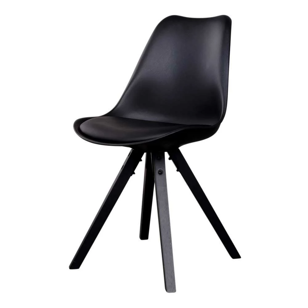 - Leicht schräg konstruiertes, schwarzes Vierfußgestell aus massivem Holz